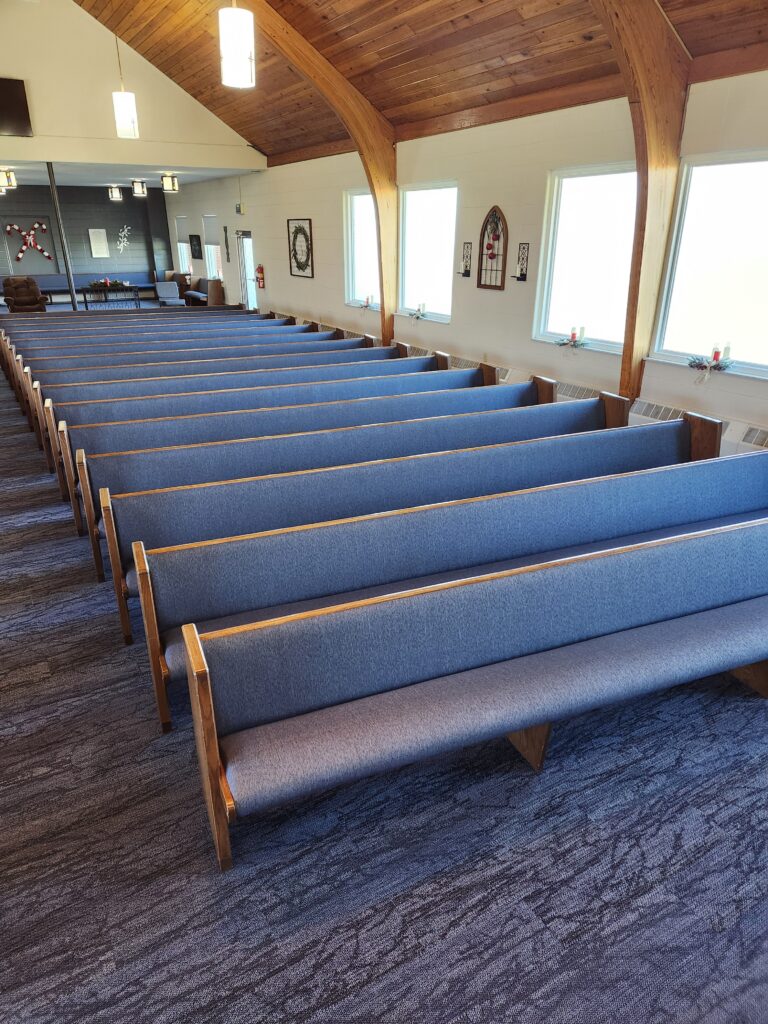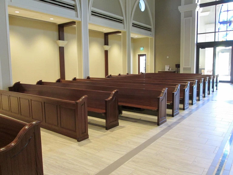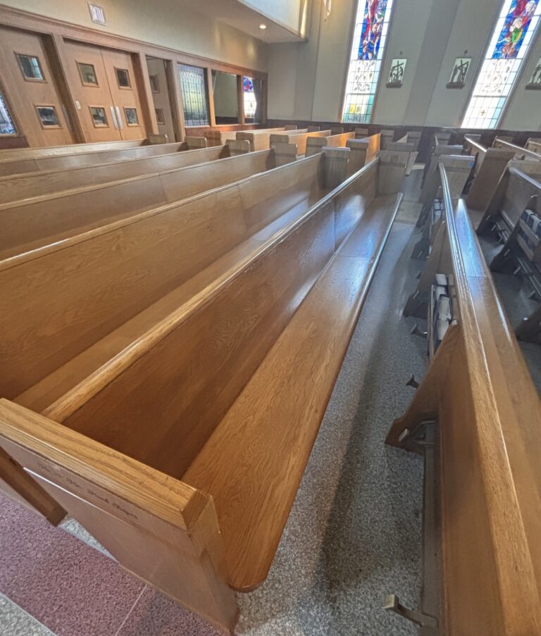 Completed 2025 On-site pew refinishing of pews. Learn more about Pew Refurbishing & Restoration Services.