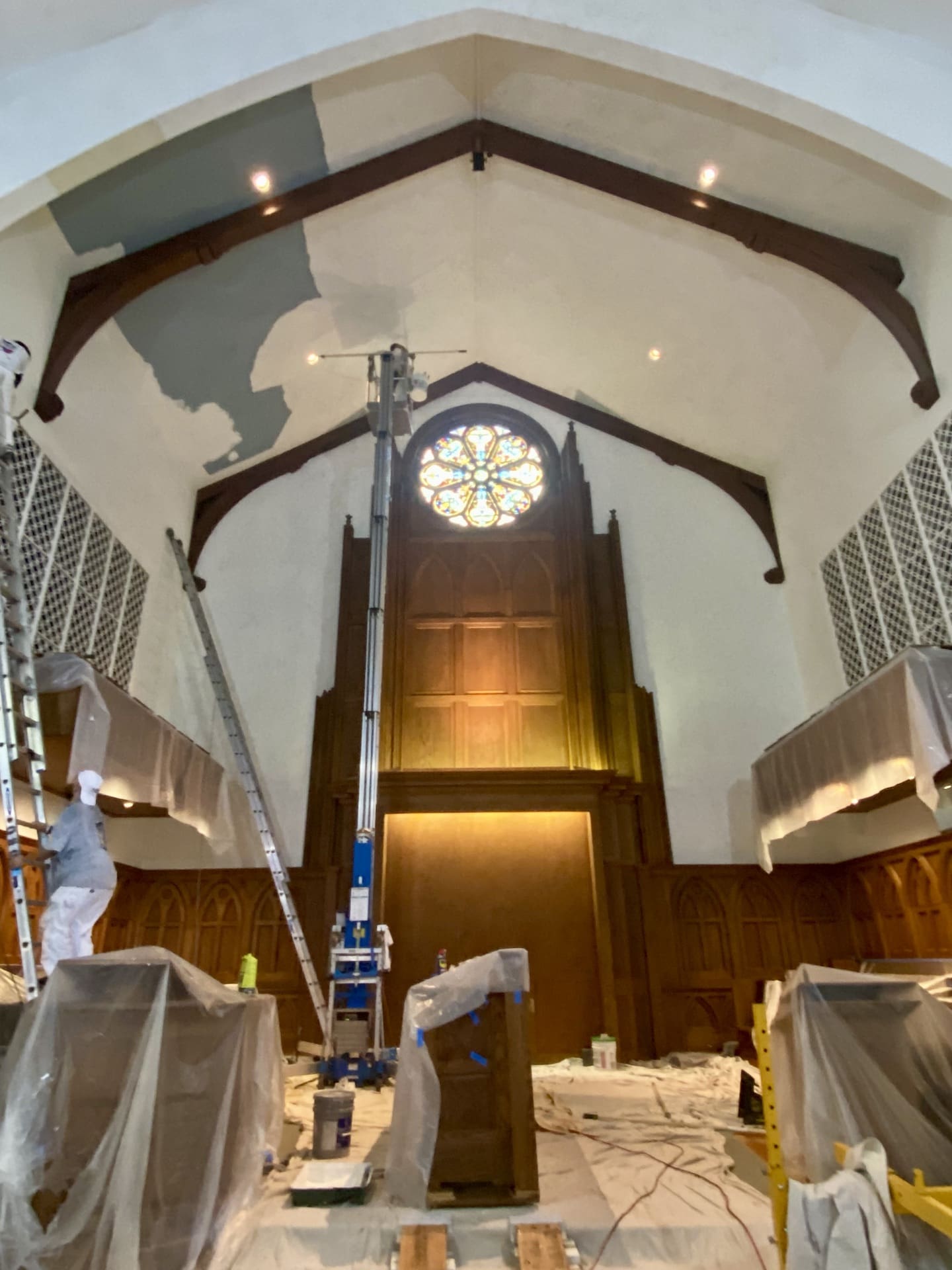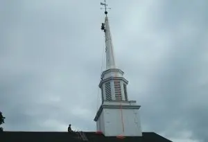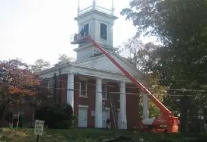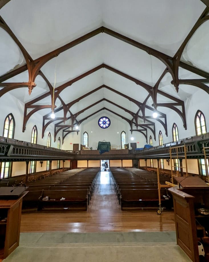 On the exterior, we provide service for historic roofing, window and stained-glass preservation, steeple, spire, and tower repairs, exterior paint, and masonry repairs.