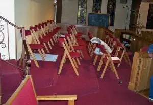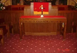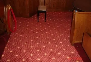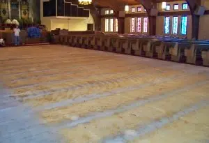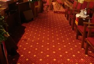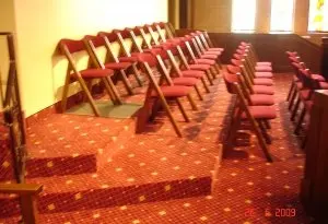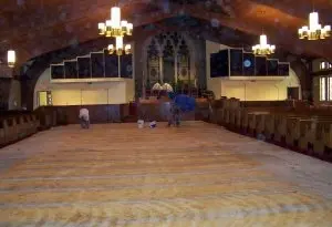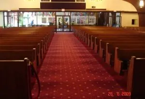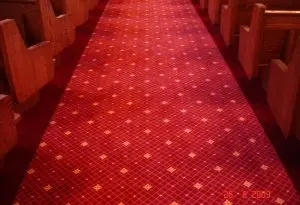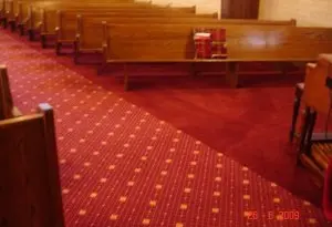 Installed new custom designed carpet, moved and reinstalled pews. (Color: Burnt Henna #8385, Strikeoff E0220104C Based on D-7141)