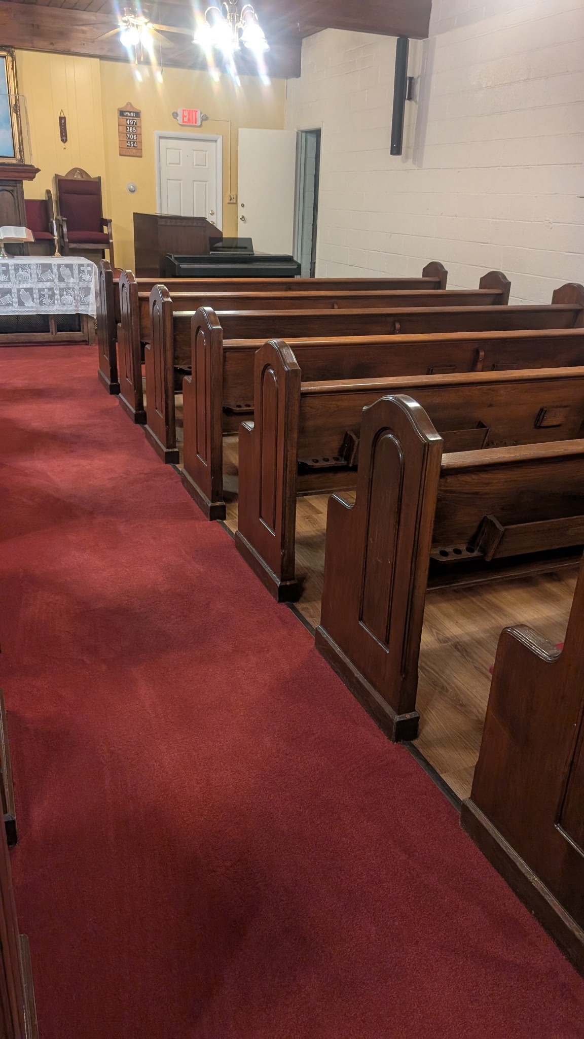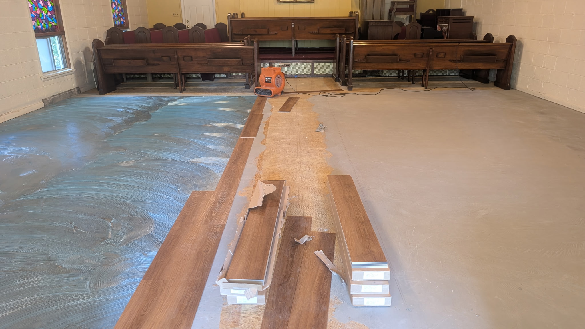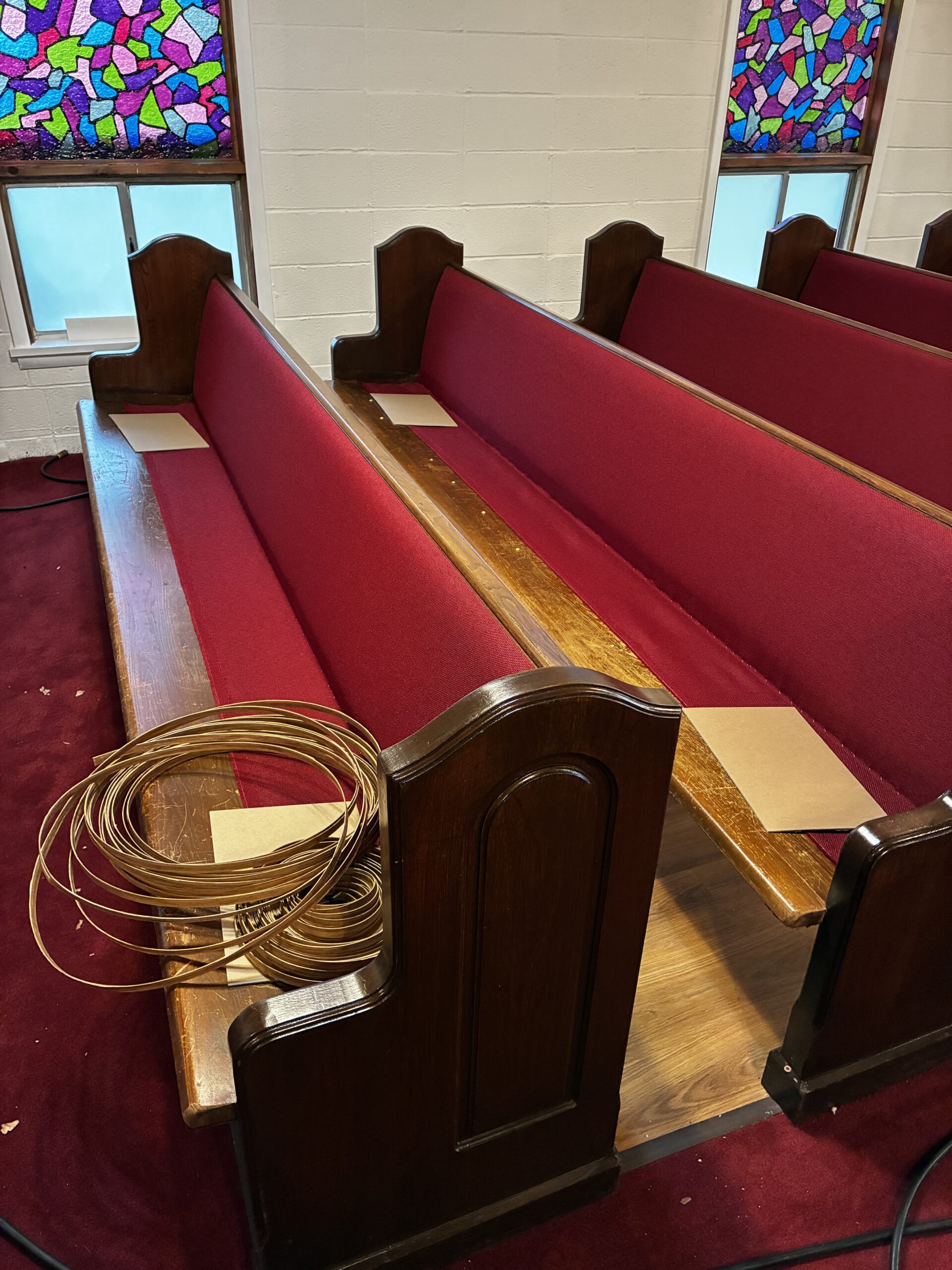 Interior Renovation: New flooring installed throughout the Sanctuary, including under the pews. On-site pew refinishing and reupholstery.