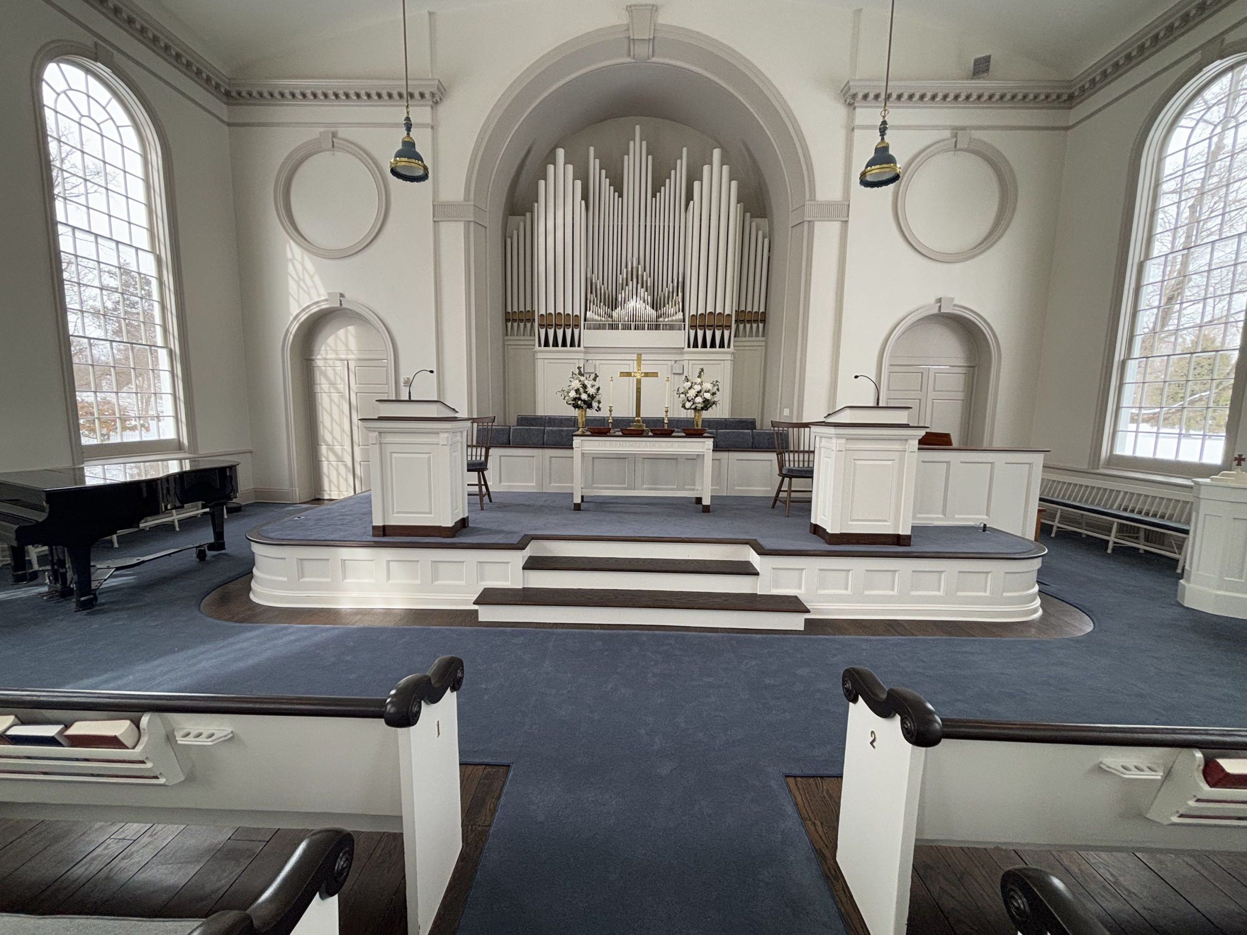 New Communion Table, Pulpits, and upholstered wood chairs crafted & installed by New Holland Church Furniture.