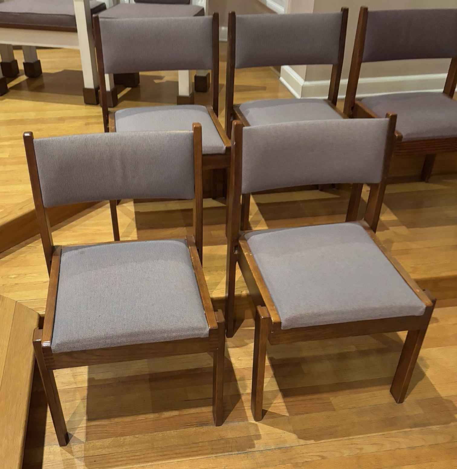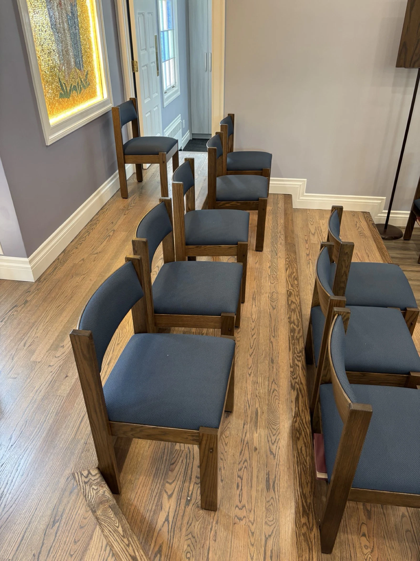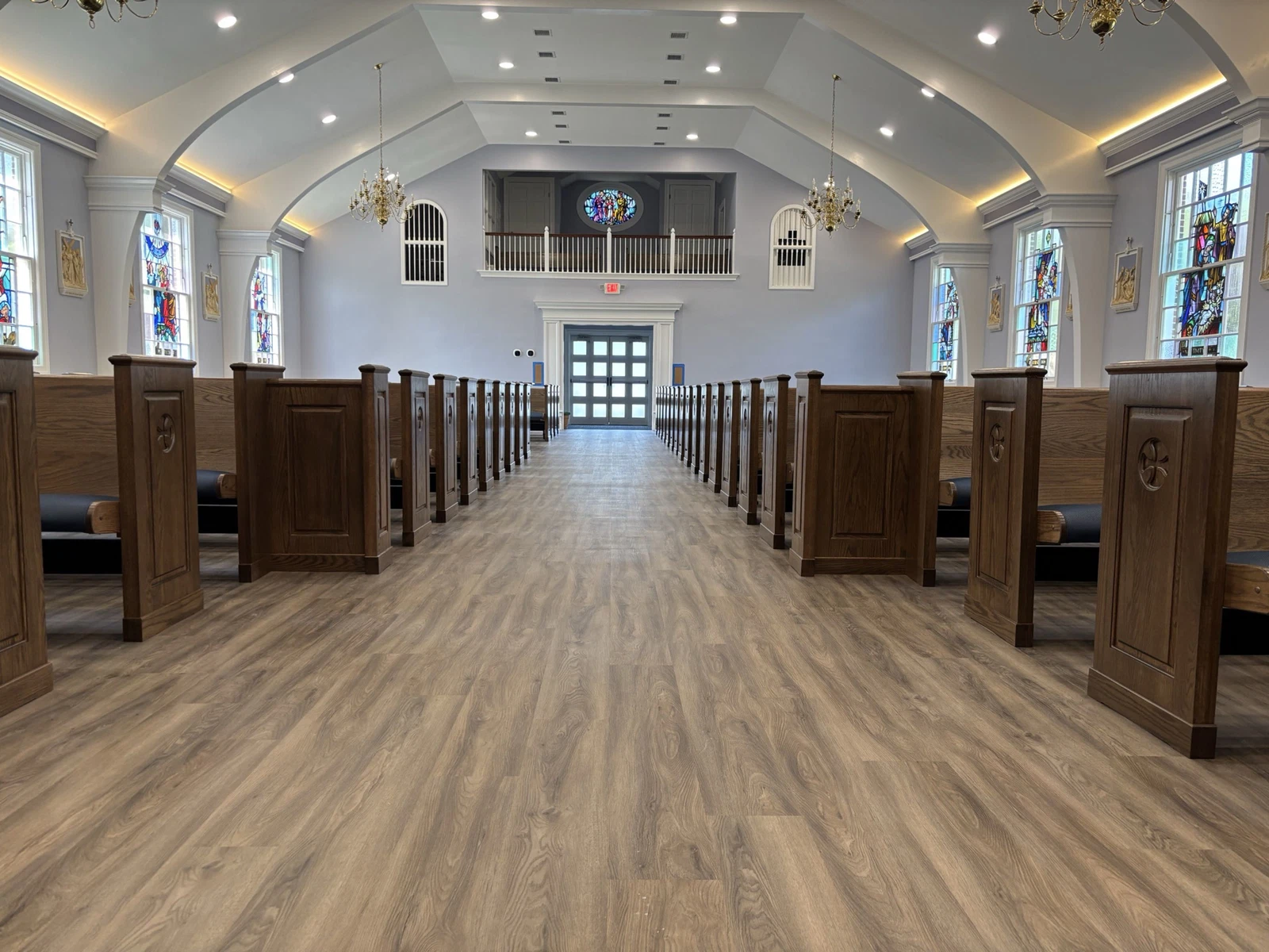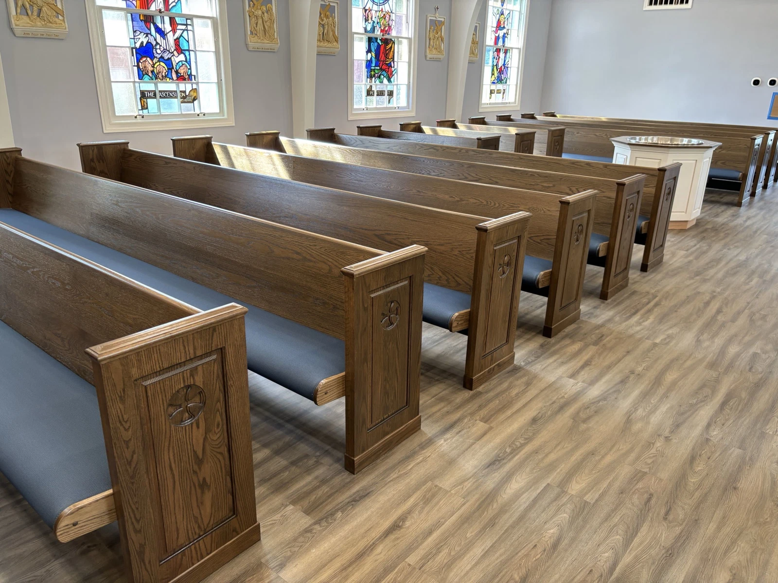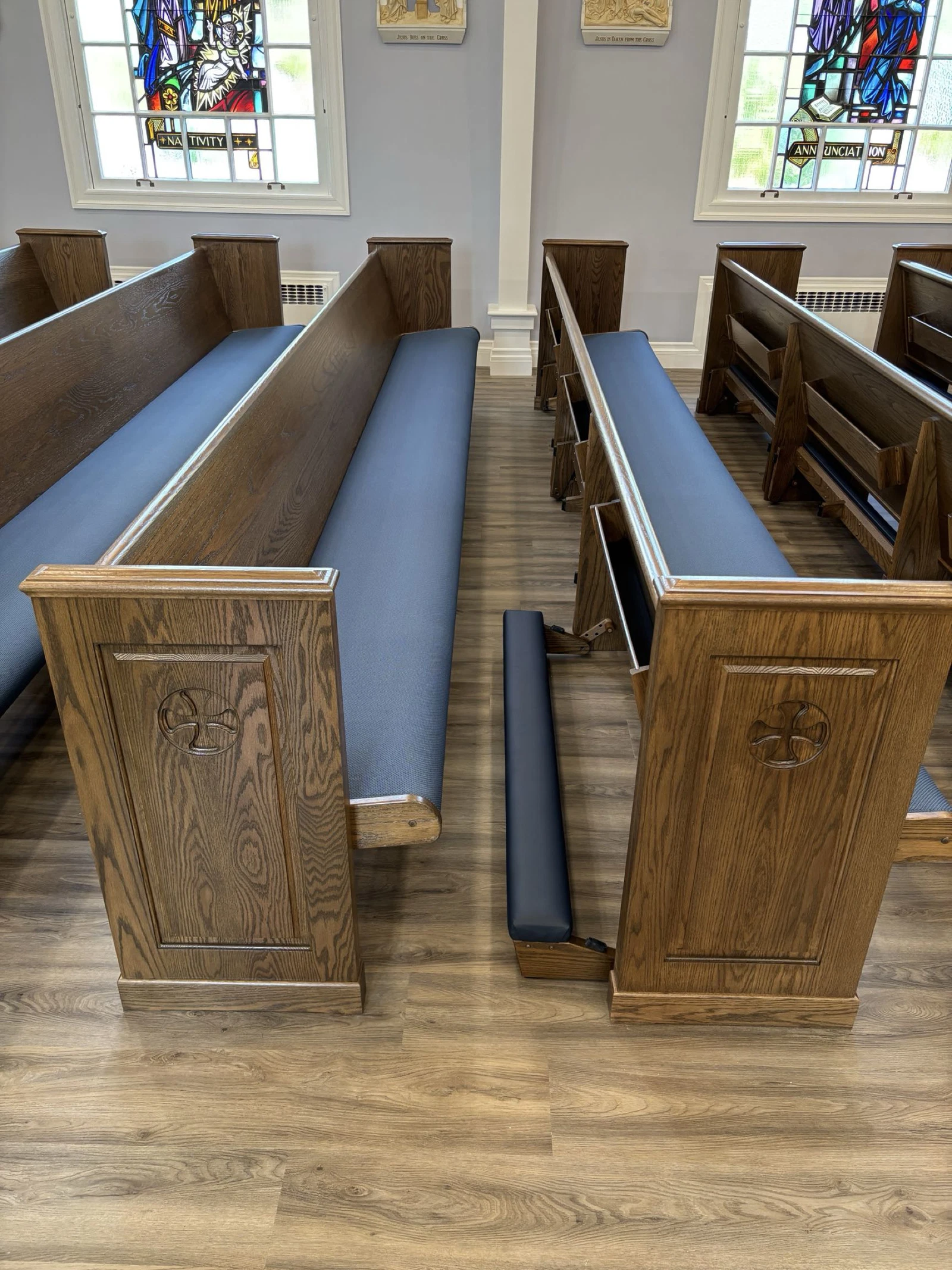 New upholstered pews with kneelers and engraved fleur-de-lis on the pew end to complement existing furniture. Matching upholstered chairs to compliment pews. Crafted and installed by New Holland Church Furniture.