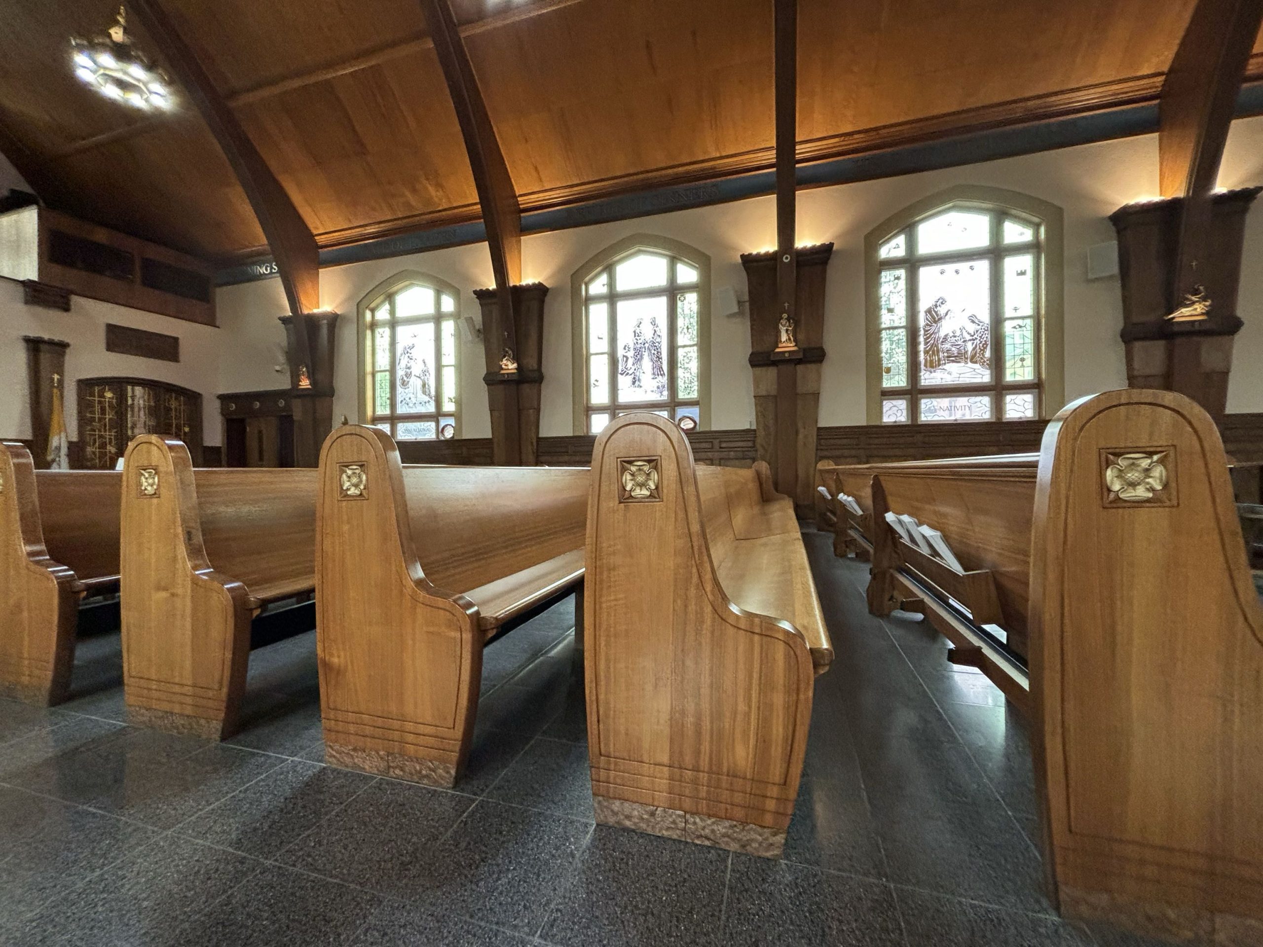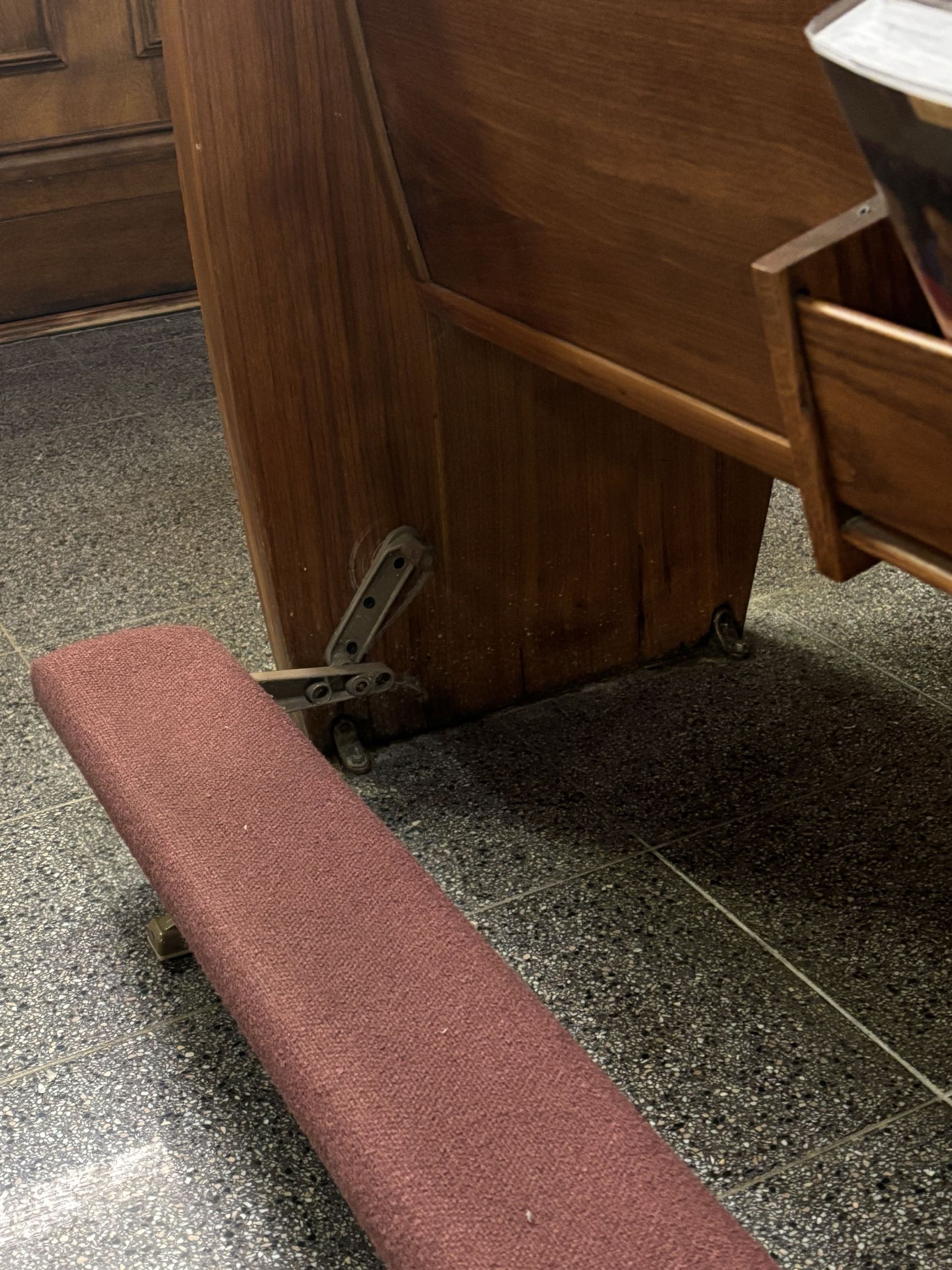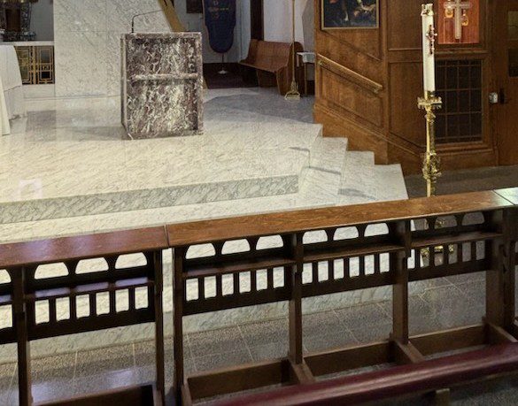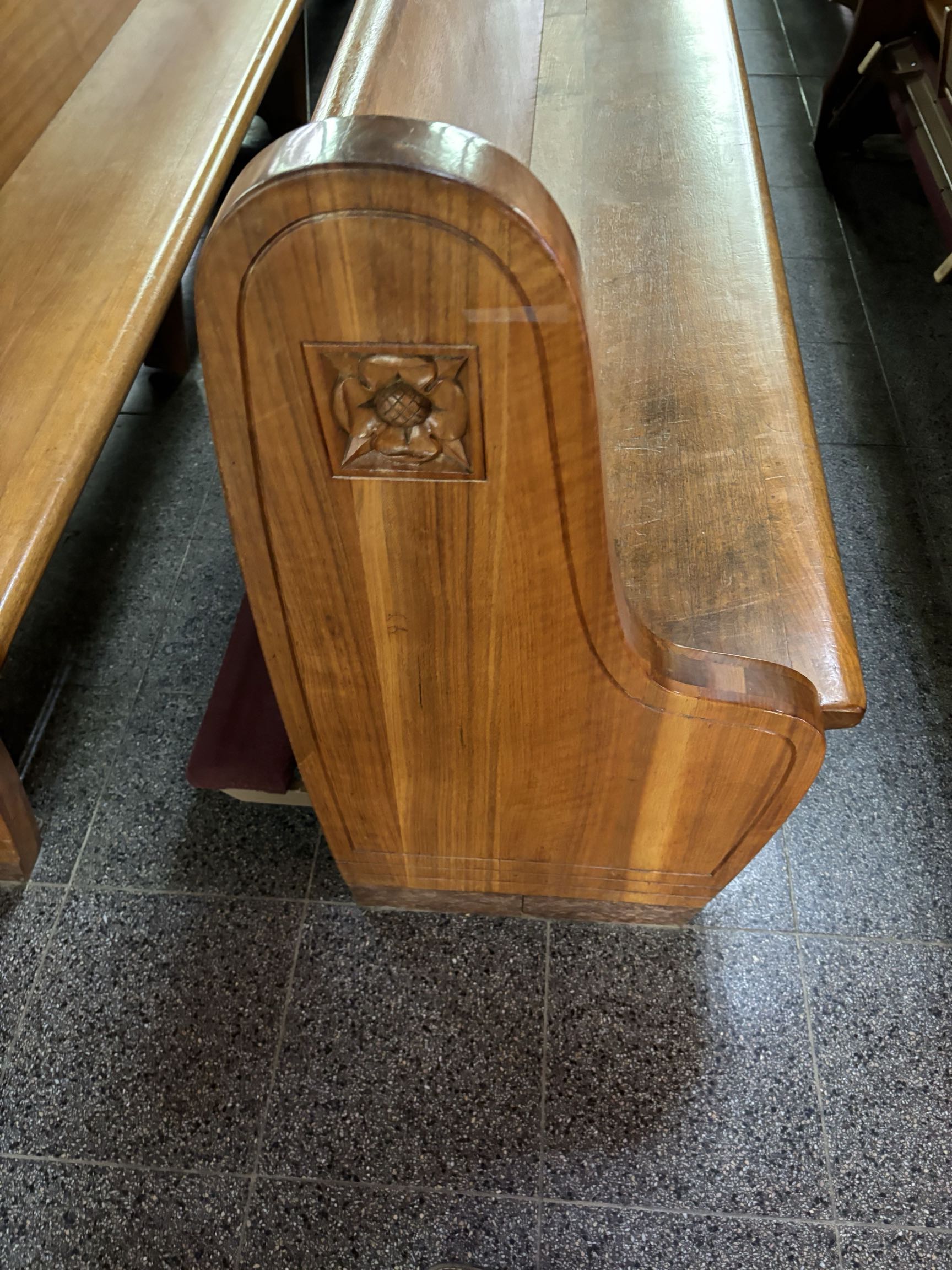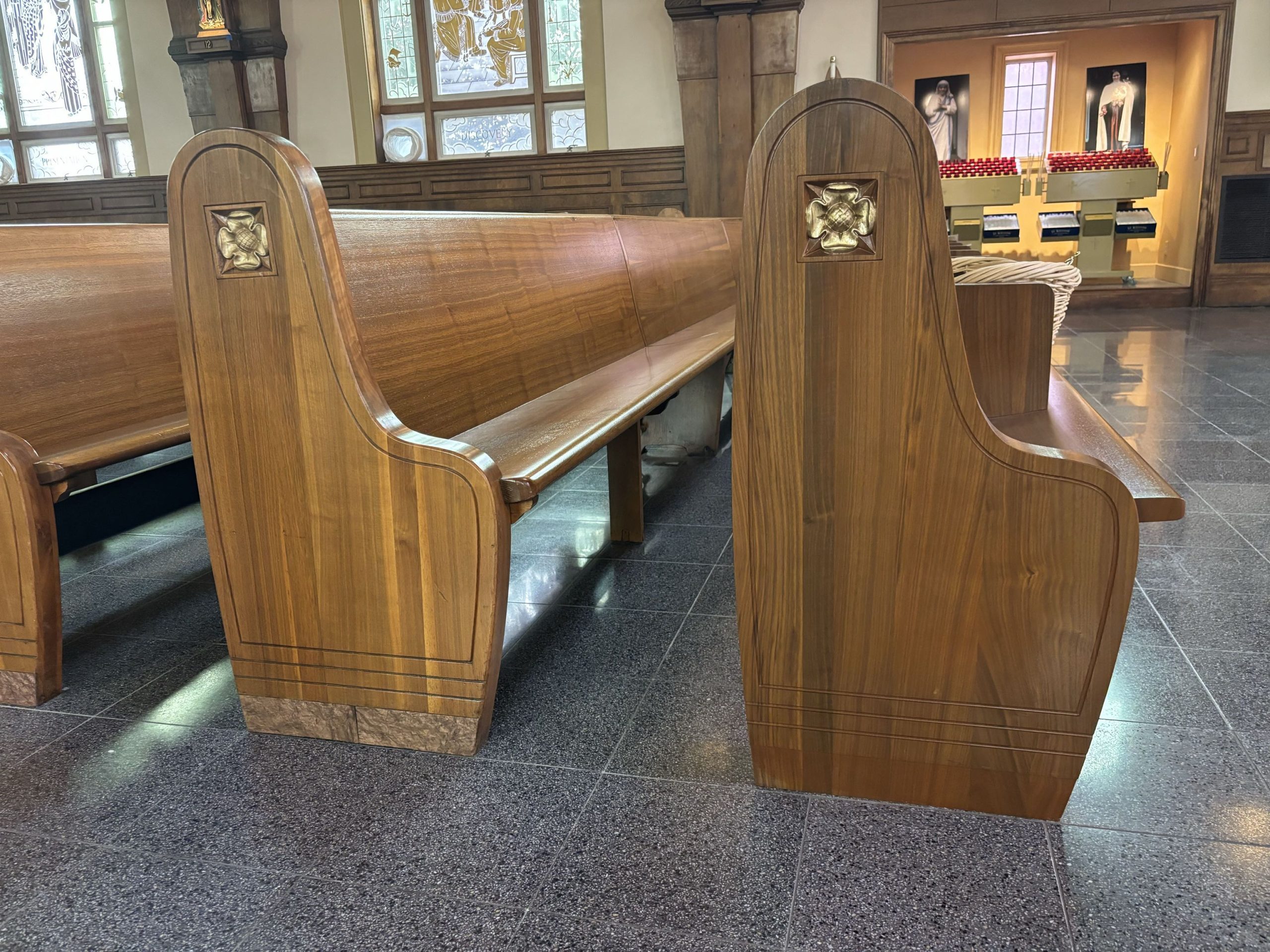 Interior Renovation: off-site refinishing and gold detail of rosettes for existing pews, fabrication and installation of new kneeler pads for Prie Dieu and new cushions for Altar railing.